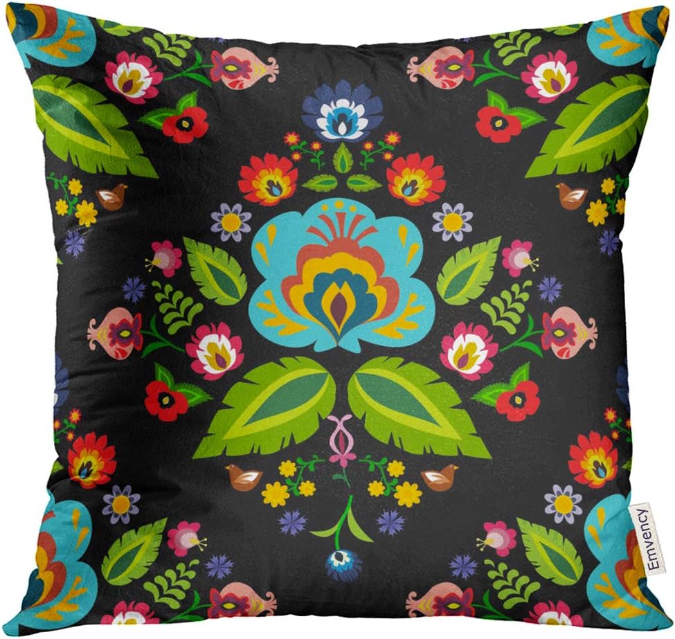 Amazon Com Upoos Throw Pillow Cover Colorful Hungarian Traditional Polish Folk Floral Pattern Green Poland Black Decorative Pillow Case Home Decor Square 18x18 Inches Pillowcase Home Kitchen